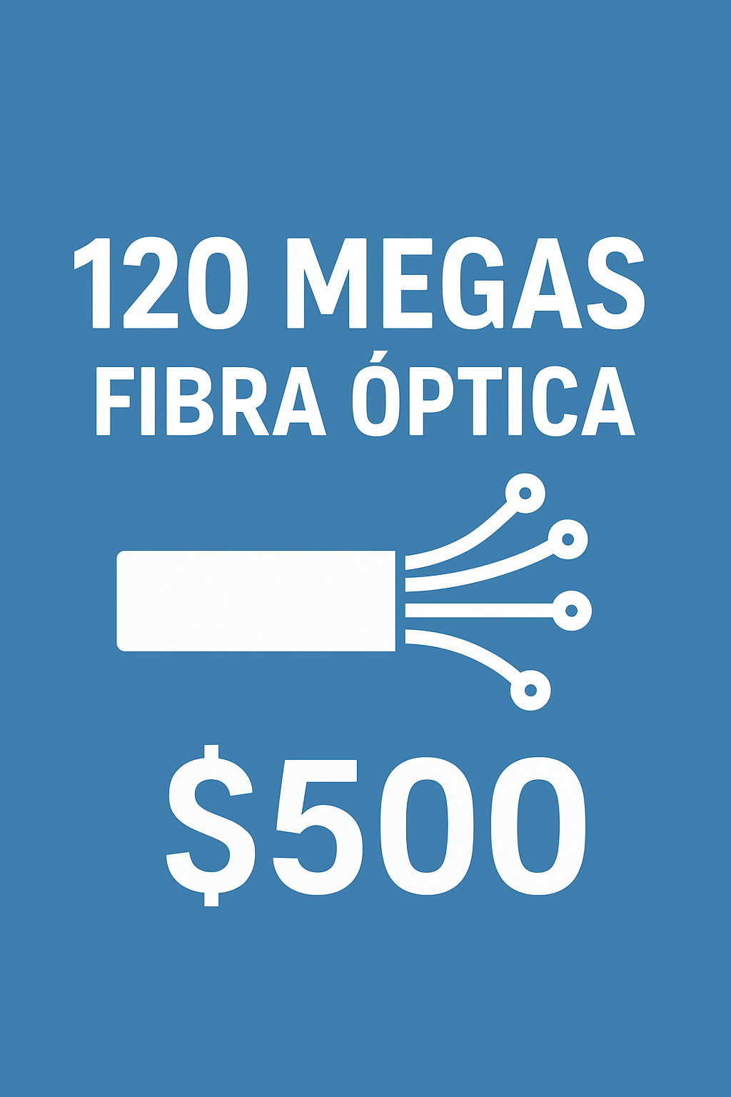 El Paquete 120 Megas Fibra Óptica es una opción de alta capacidad diseñada para hogares grandes, negocios o usuarios que exigen una conexión robusta, rápida y totalmente estable. Con 120 megas reales, podrás realizar cualquier actividad digital sin límites, incluso con muchos dispositivos conectados al mismo tiempo.